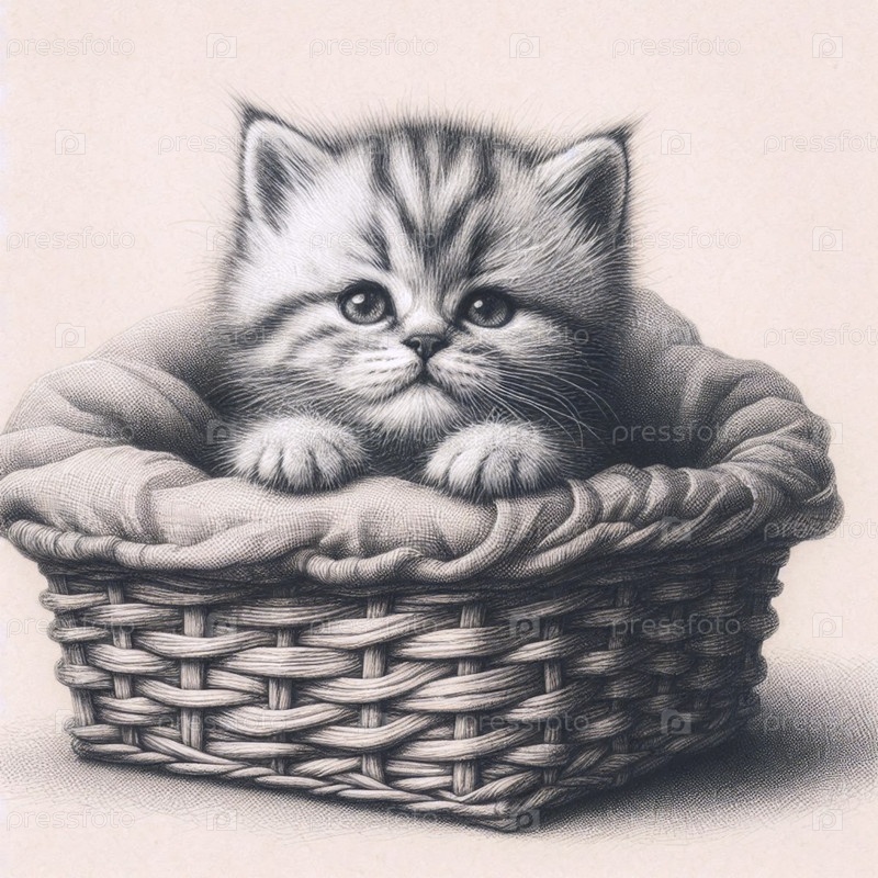 A kitten in a wicker basket ink drawing art print, Ai generated image Котенок в плетеной корзине чернил рисование художественное печать, Ай создал изображение