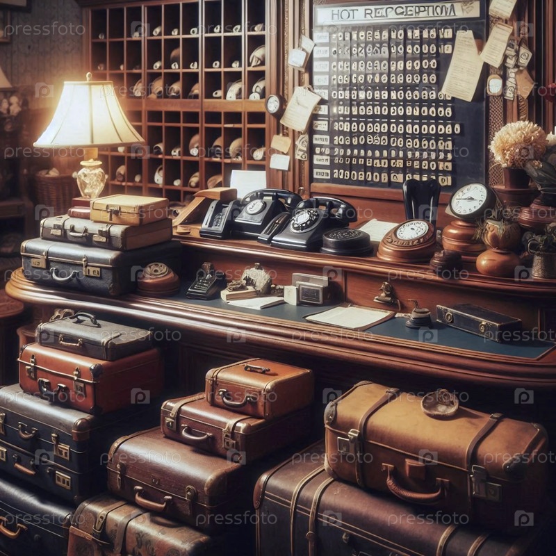 Гостиничный приемный стол с 1920-х годов с винтажным багажом, Ai generated image