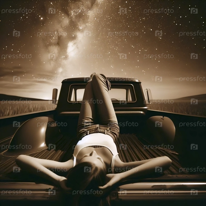 Девушка, лежащая на капоте автомобиля и глядя в звезды, Ai generated image