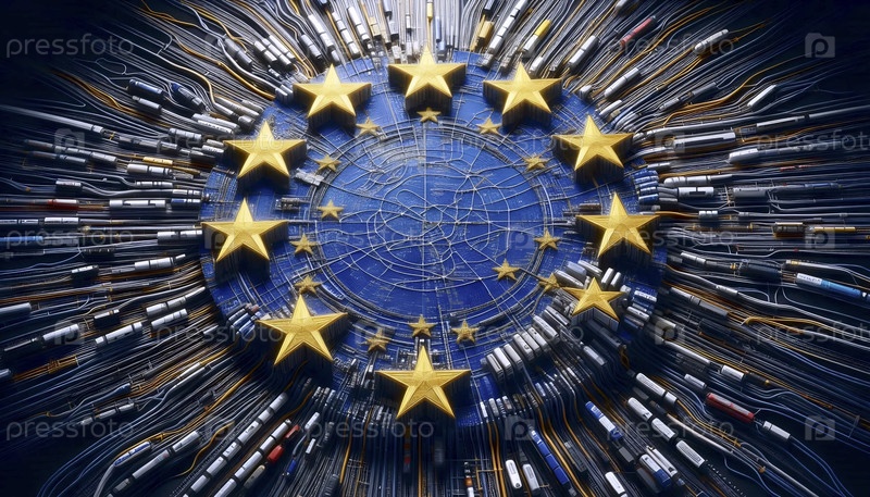 Флаг Европейского союза сделан из взаимосвязанных железнодорожных сетей, Ai generated image