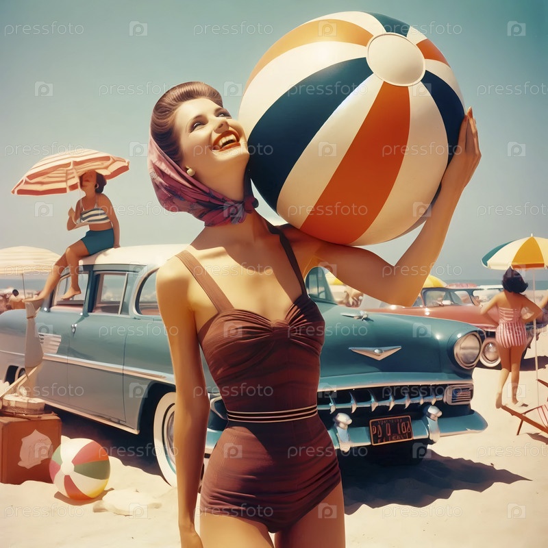 Пляжная девушка 1950-х годов с винтажным пляжным мячом, Ai generated image