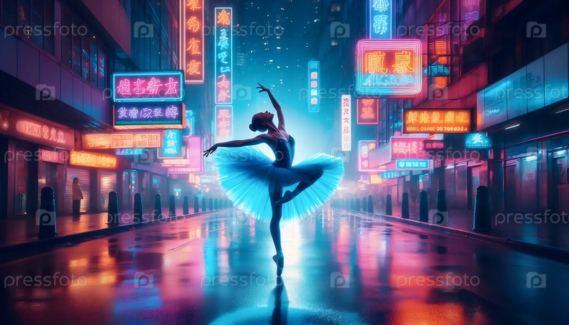 Неон-нуар балерина в дождевой аллее, Ai generated image