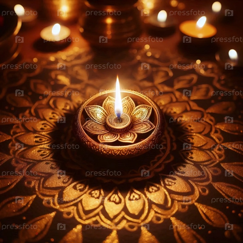 Лампа diya с рисунками ранголи вокруг нее, Ai generated image