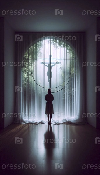 Силуэт распятия, увиденный через простую завесу с фигурой, Ай создал изображение