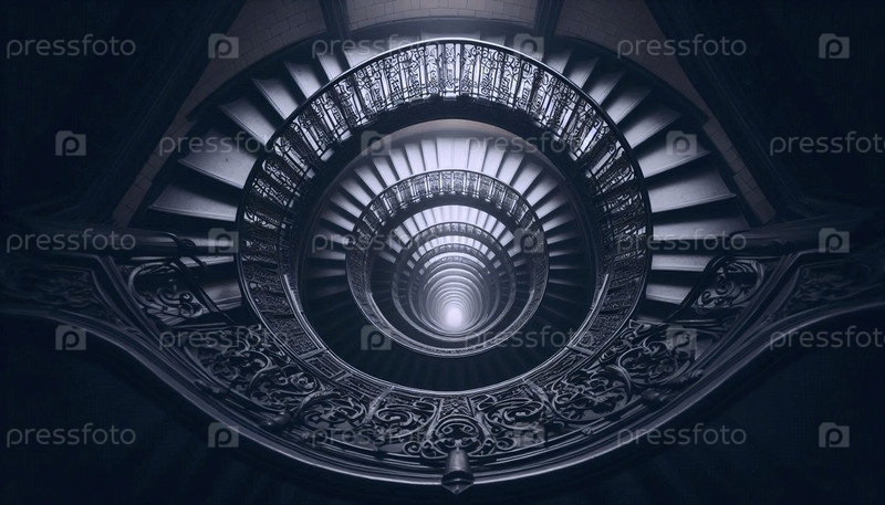 Геометрическая абстракция спиральной лестницы, сделанная непосредственно сверху и создающая гипнотический вихревой рисунок, Ai generated image