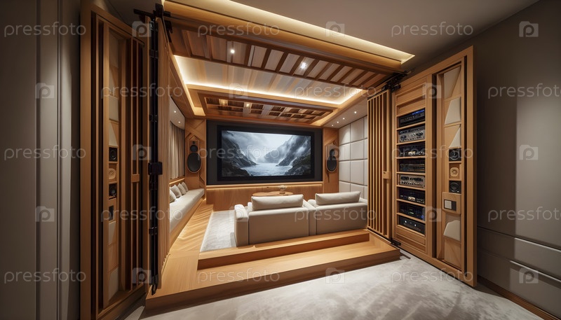 Скрытый домашний кинотеатр, раскрытый скользящими деревянными панелями, Ai created image