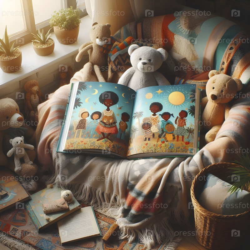 Открытая детская книга с яркими иллюстрациями, окруженная плюшевыми игрушками и уютным одеялом, Ай создала изображение