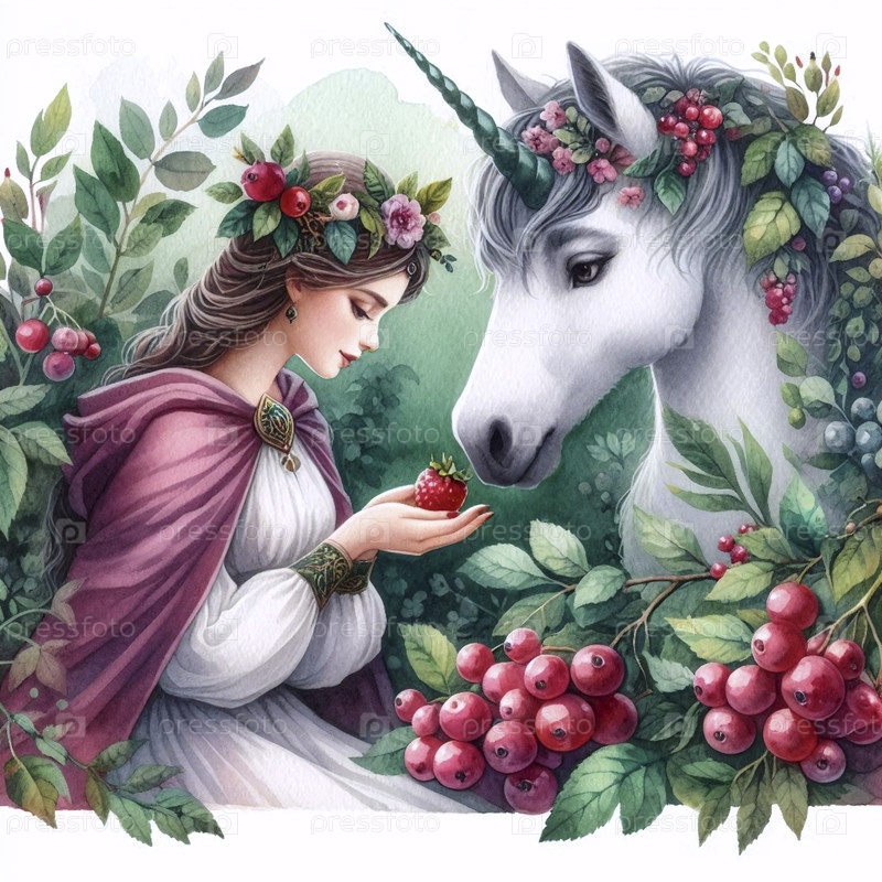 Принцесса и единорог Делятся акварельной живописью Берри, Ai generated image A