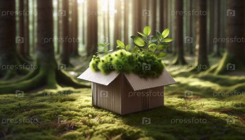 Простой макет картонной коробки с живым мхом, растущим естественным образом в одном из его влажных уголков, в затененной лесной обстановке, Ai создал образ