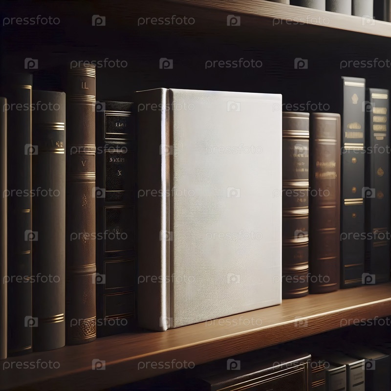 Мокет книги в жесткой обложке с пустой лентой, расположенный между другими книгами на полке, Ai generated image