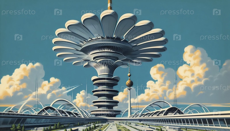 Колоссальная коммуникационная башня в стиле Googie, напоминающая замороженный атомный взрыв, пробивающая облака