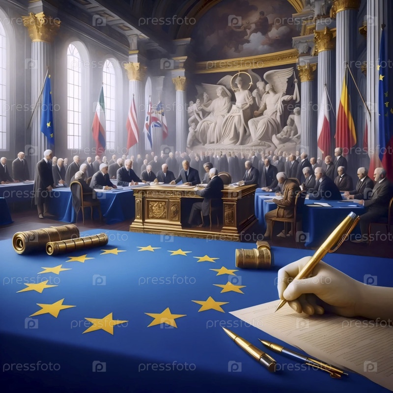 Флаг Европейского Союза во время подписания исторического договора, Ai generated image