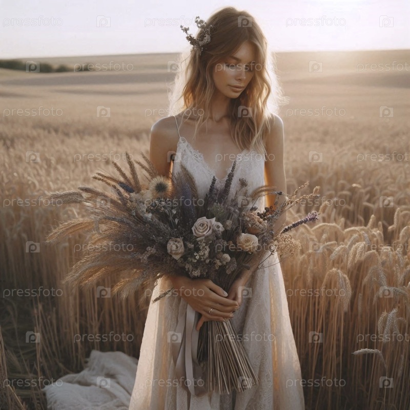 Невеста с букетом диких цветов в поле, Ai generated image