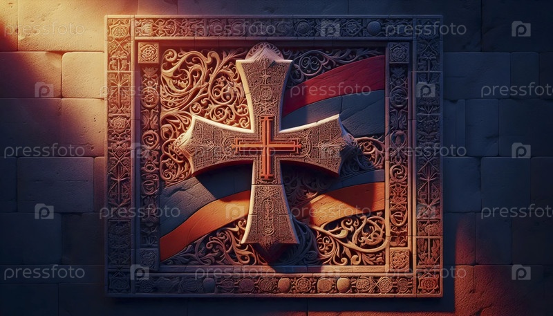 Армянский флаг в сложных каменных крестовых камнях хачкаров, Ai generated image