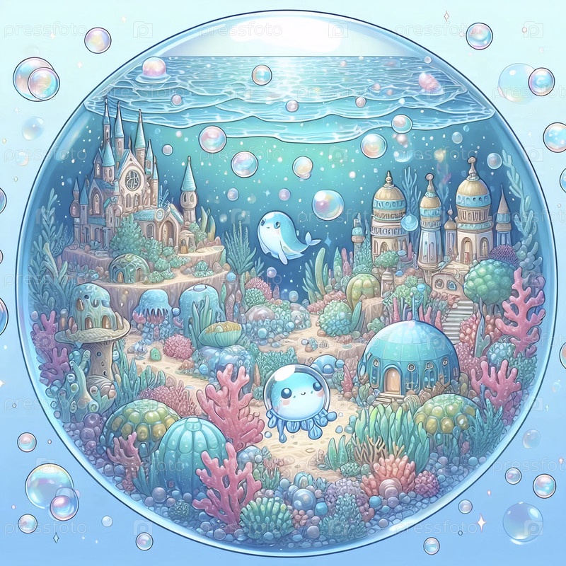 Подробная иллюстрация кавайи подводного города в пузыре, Ai generated image