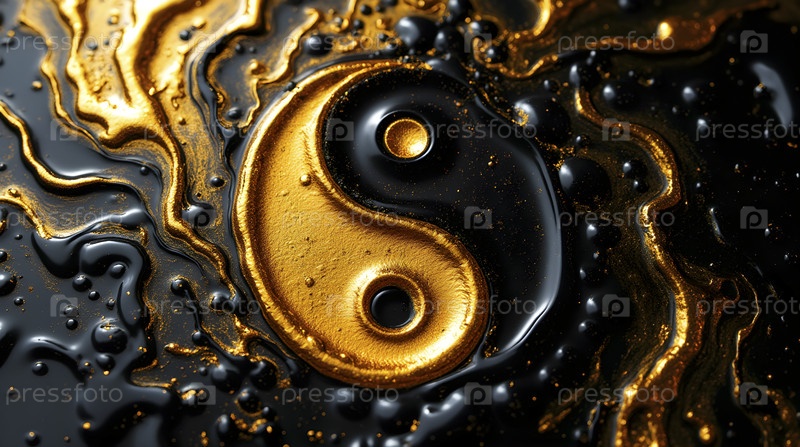 Жидкое золото, вращающееся в черном масле как символ инь-янга, изображение, сгенерированное ИИ