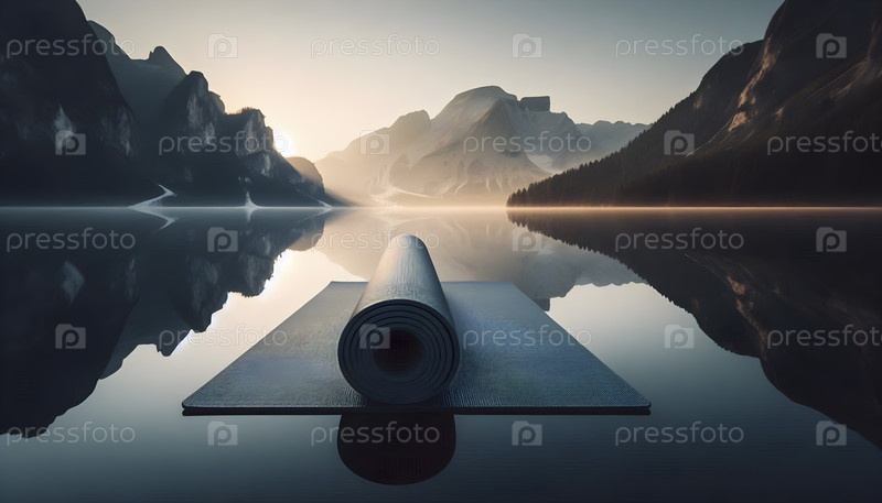 Матка для йоги, плавающая на спокойной поверхности озера на рассвете, Ai created image