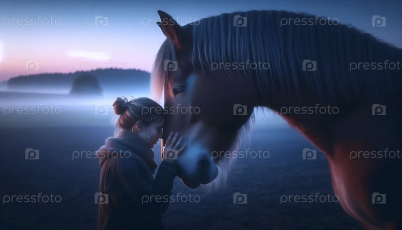 Женщина шепчет лошади на рассвете, Ай создал изображение