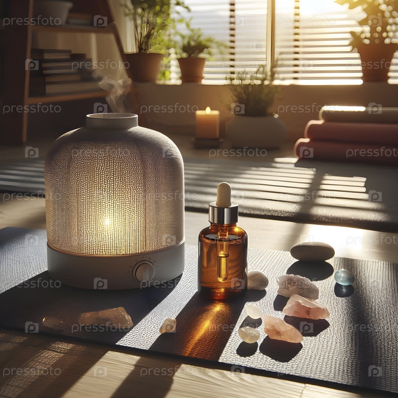 Матка для йоги с диффузором эфирного масла и кристаллическими камнями, Ai created image