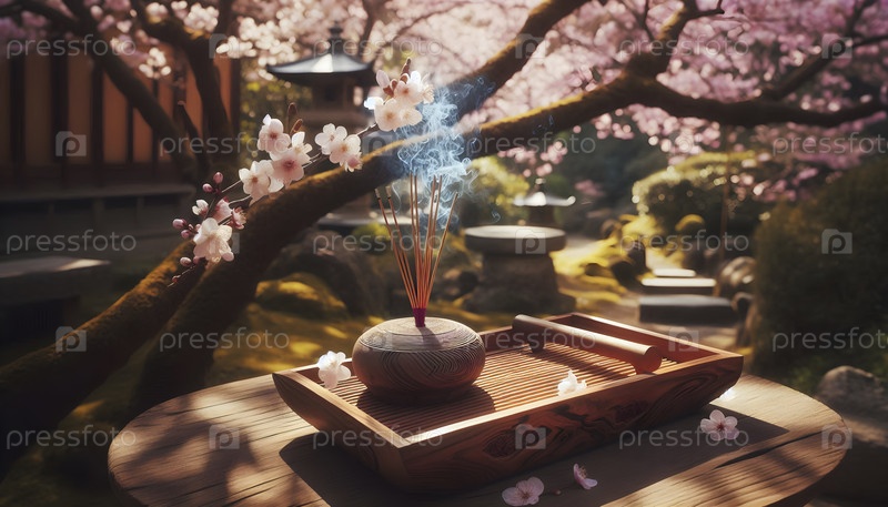 Деревянная скамейка для медитации в саду вишневых цветов, Ai created image