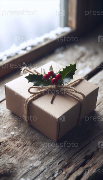 Мокет подарочной коробки из крафт-бумажной бумаги, украшенный веточкой свежей ольхи и ягод на деревянном столе, Ai generated image