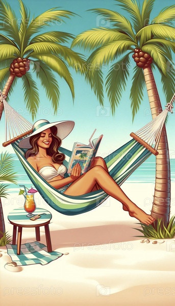 Пин-ап девушка в гамаке между двумя пальмовыми деревьями, читает журнал, Ai generated image