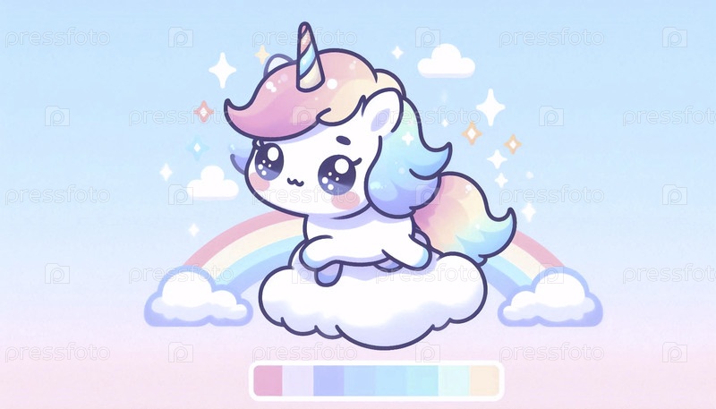 Простой кавайский единорог с радужным гривом, Ai generated image