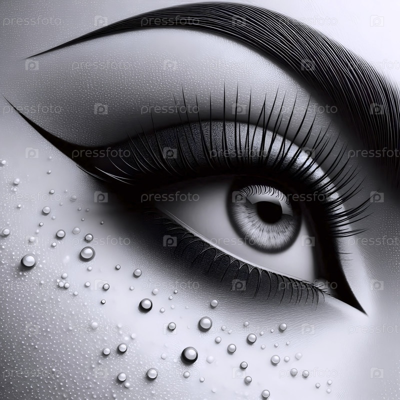 Экстремальный портрет красоты на близком расстоянии, фокусирующийся на глазу с помощью геометрического жидкого лайнера для глаз и капель росы, Ai generated image
