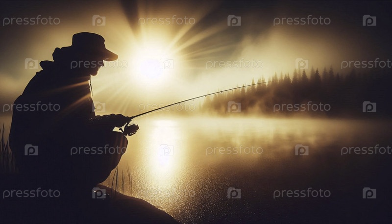 Рыбак, бросающий сеть с небольшой деревянной лодки на восходе солнца в туманном озере, освещенный золотым утренним солнцем