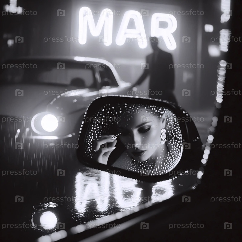 Девушка корректирует серьги в зеркале автомобиля, Ai generated image