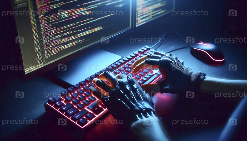 Состояние потока творческих программистов: руки, нависающие над механической клавиатурой с кодом, светящимися на темном экране, Ai generated image