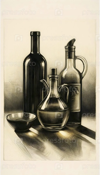 Вино и оливковое масло бутылки чернила рисование художественная печать, Ai generated image