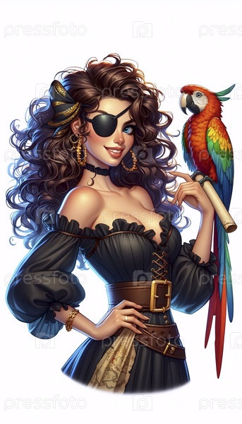 Пин-ап девушка, одетая в пирата с попугаем на плече, Ai generated image