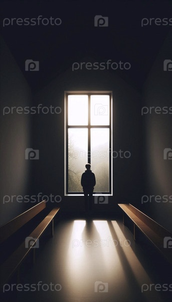 Крестообразное окно с фигурой, глядящей наружу, если смотреть изнутри, Ai создает изображение