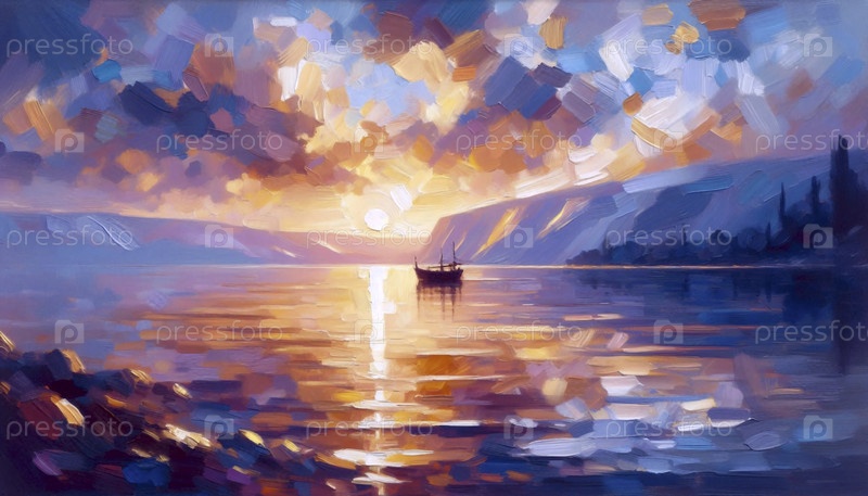 Галилейское море в золотое время, импрессионистский стиль, Ai generated image