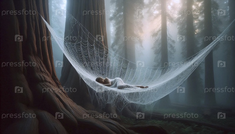 Женщина спит в гигантской паутине секвойи, Ai generated image