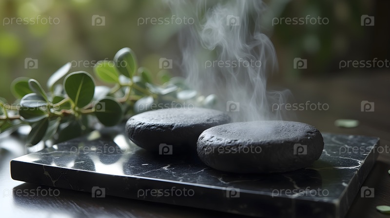 Пар поднимается с нагретых базальтовых камней, изображение создано искусственным интеллектом