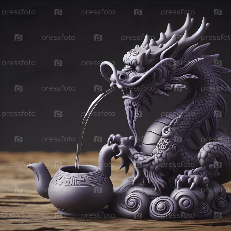 Домашний чайный питомец в форме дракона брызгает воду из крошечного чайника, Ai created image