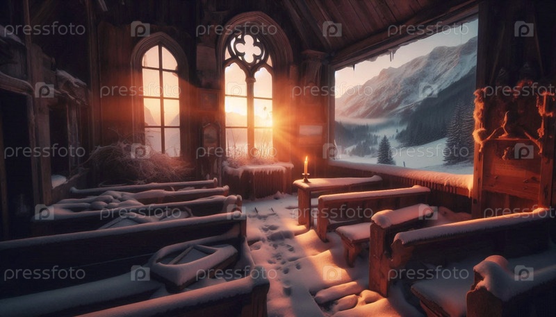 Заброшенная горная часовня на восходе солнца, Ai generated image