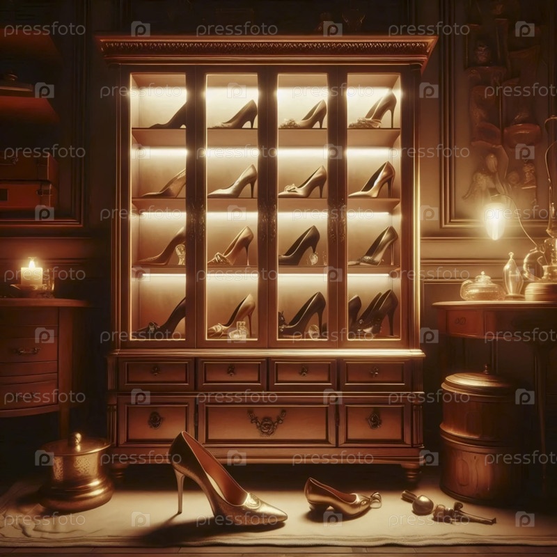 Открытый шкаф с одной обувью на освещенных полках, Ai generated image