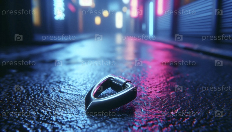 Чистый геометрический макет залога на подвеске, лежащий на дождливом черном асфальте под неоновыми знаками в темной аллее, Ai generated image