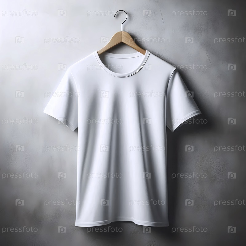 Простой белый макет футболки на простом деревянном вешальнике, против бетонной стены, Ai generated image