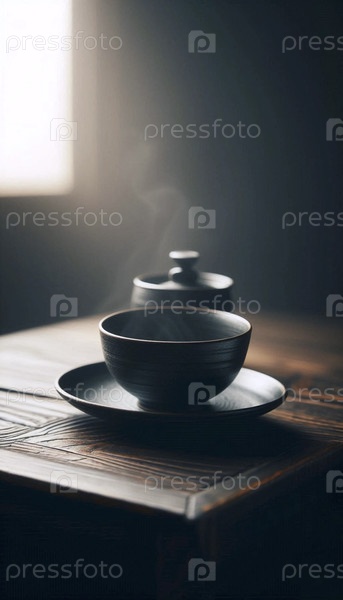 Черный фарфоровый кофеварка и макет тарелки на темноокрашенном дубовом столе, Ai generated image