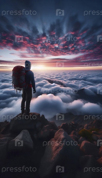 Момент триумфа и размышления туристов на вершине горы в рассвете, Ай создал изображение