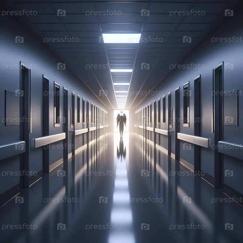 Более широкий снимок изнутри пустого коридора больницы, просматривая фигуру в окне, Ай создал изображение