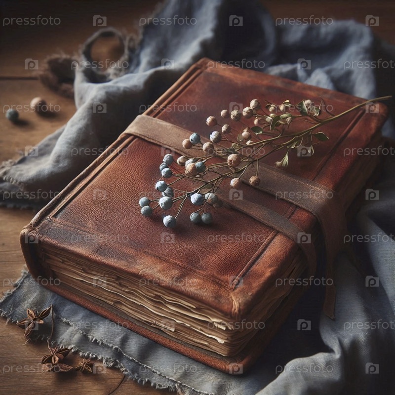 Закрытая антикварная книга с высушенной ластовой ветвью закладки, Ai generated image