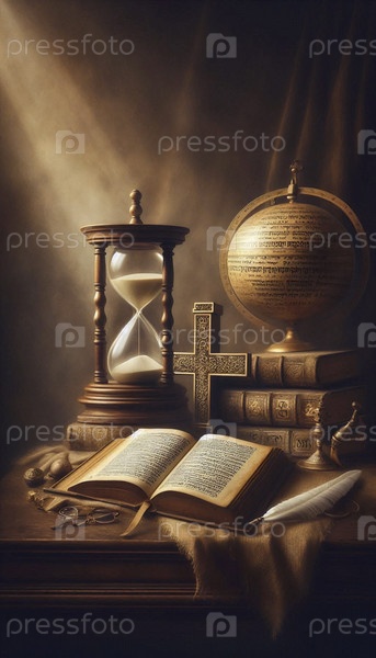 Натурм с песочными часами, крестом и открытой книгой Ai generated image