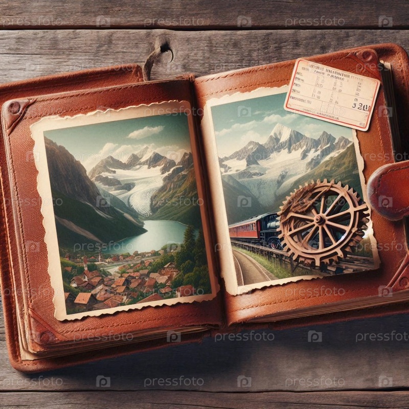 Worn leather postcard album open to reveal vintage Swiss Alps views, Ai generated image (Весенние швейцарские Альпы), созданное изображением Ай
