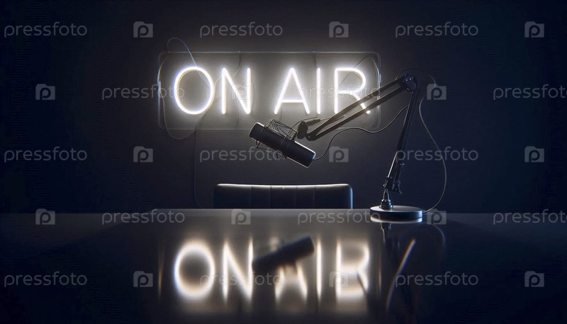 Мокет черного стеклянного стола с микрофоном в пустой руке, под светом пользовательского неонового знака "ON AIR" (выключенный), Ai создал изображение