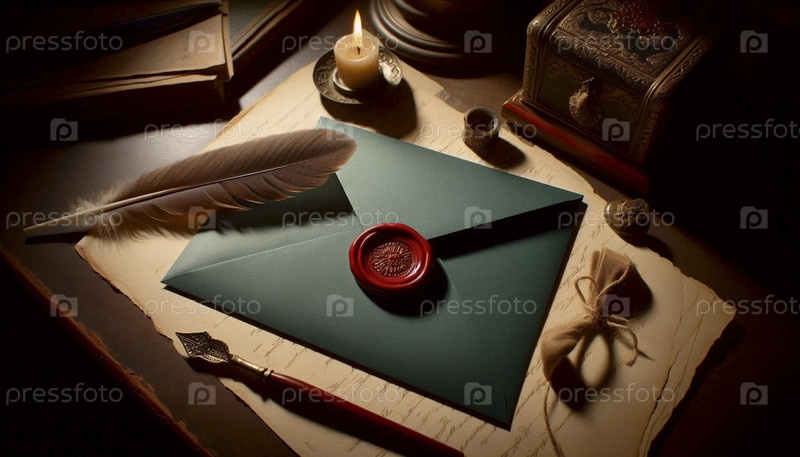 Мокет темно-зеленого конверта с пустой, красной восковой печатью на столе с пернатым песком Ai generated image